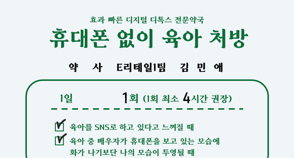 퇴근하고 아이를 보면서 육아 정보 찾는다고 SNS를 둘러보기도 하고, 정보를 검색하는 게 일상이었는데 어느 날은 아이를 보며 똑같이 휴대폰을 보고 있는 남편을 보고 ‘혹시 나도 저런 모습이었을까(ㆆ.ㆆ )’하는 생각이 문득 들더라구요. |