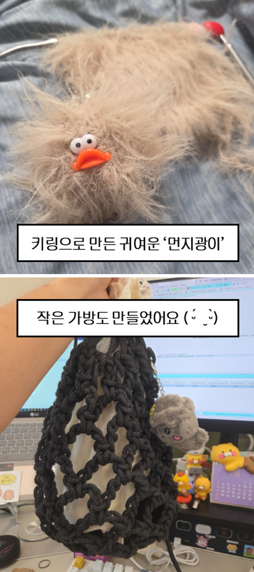 처음에는 비교적 쉽게 만들 수 있는 키링, 작은 가방을 만들었고, 지금은 작은 조각들을 이어 만드는 모티브 파우치를 만들고 있어요. 점점 실력이 늘면 모자나 담요, 의류까지 차차 도전해 볼 생각이에요. 소소하지만 새로운 목표와 성취감도 생기고 무엇보다 휴대폰 볼 틈이 없으니 이보다 좋은 디지털 디톡스는 없는 것 같아요 ദ്ദി˶ˊᵕˋ˵) |