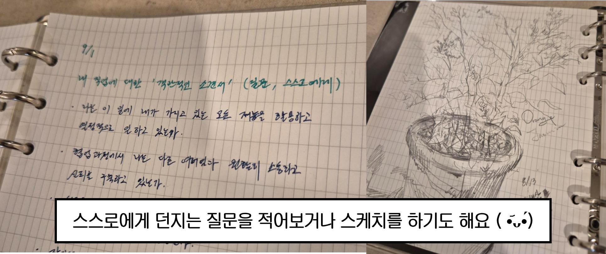 제가 찾은 방법은 한 달에 하루 손 글씨 쓰는 시간을 갖는 것. 매번 온라인 메신저에서 ‘ㅋㅋㅋ’ ‘ㅇㅋ’ 이런 말들만 쓰다가 머릿속 생각을 종이에 옮겨 보기도 하고, 좋은 글귀를 써 내려가는 것부터 시작했어요. 손 글씨 쓸 일이 거의 없는 요즘인데 펜이 종이에 닿는 느낌도 좋고, 괜히 명언 같은 걸 찾게 되고(ㅎㅎ) 다 쓰고 나면 뭔가 뿌듯한 느낌이 들어요. 부작용이 있다면 새벽 감성의 글을 쓴다는 점 (「๑•₃•)「 ʷʱʸ?