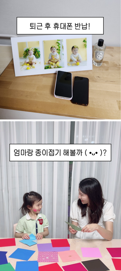 주중 저녁엔 고작 서너 시간 함께 보내는 게 전부인데 아이를 생각한다고 아이보다는 휴대폰에 눈을 돌렸던 저의 행동들이 떠오르며 미안한 마음이 들었어요.