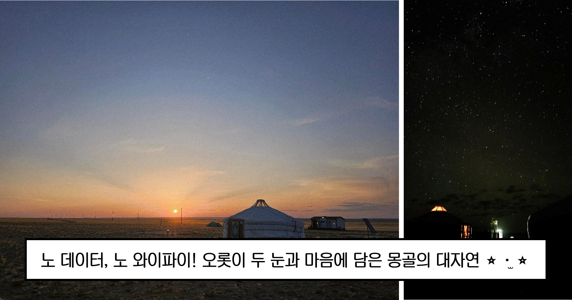 몽골은 도시를 조금만 벗어나도 데이터가 터지지 않고, 패키지여행이라 각종 검색, 지도 앱 대신 가이드를 따르면 돼서 디지털 디톡스 여행지로 제격이었어요. 사진 찍기나 검색, SNS에 몰두하는 대신 별이 쏟아지는 밤 하늘과 푸르고 광활한 대자연을 눈으로, 마음으로 오롯이 즐기고 함께한 사람들과의 대화로 여정을 꽉 채웠어요. 디지털의 개입이나 방해 없이 진정으로 ‘쉼’을 경험하는 시간이었답니다👏🏻('ࠏ' )