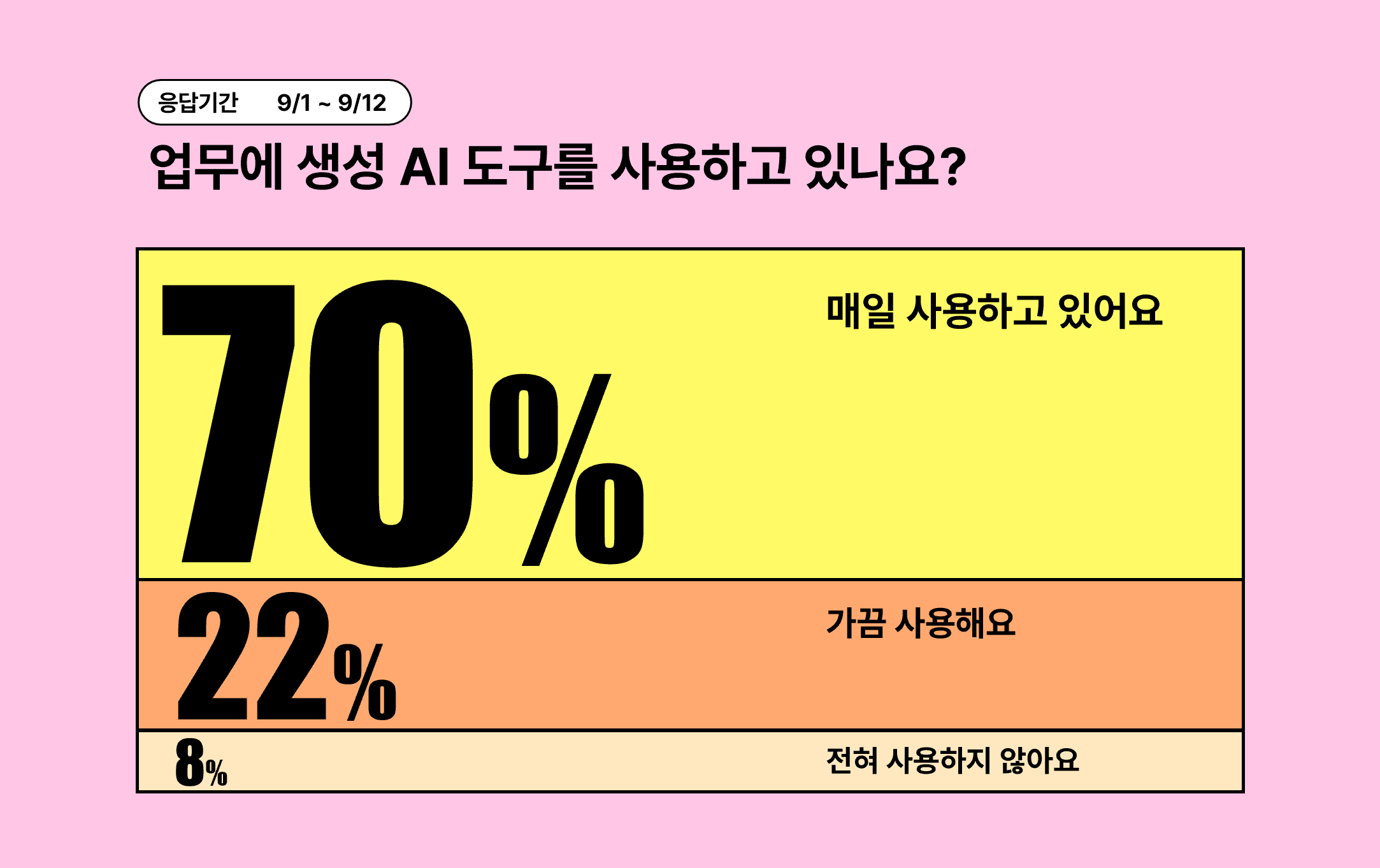 전체 응답 인원의 절반이 훨씬 넘는 70%가 업무에 생성 AI 도구를 이용하고 있는 것으로 나타났어요⸜( ˙˘˙)⸝ 실제 사용 경험은 어땠을까요? |