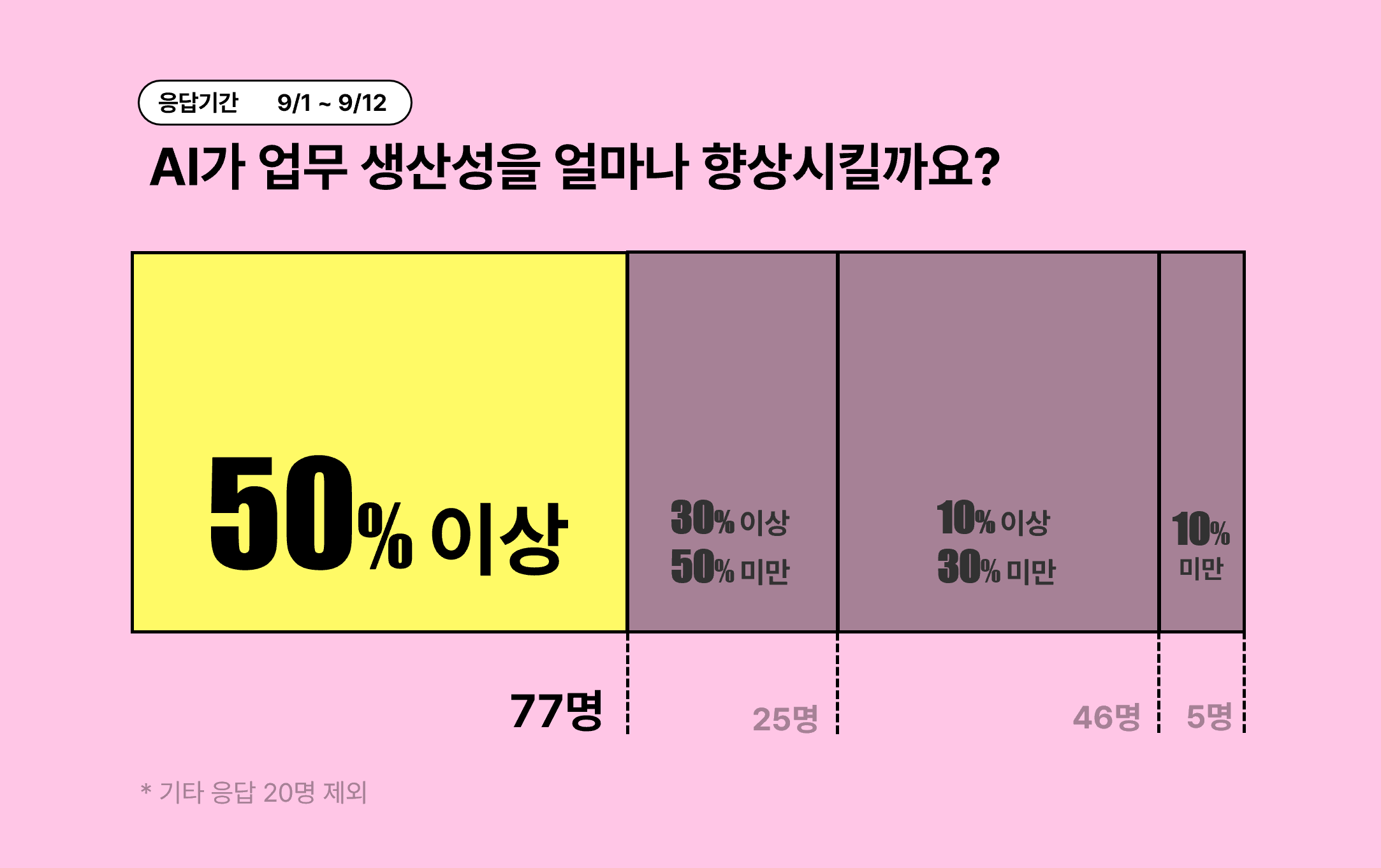 AI가 현재 대비 50% 이상의 업무 생산성을 향상시킬 수 있을거라 예측한 분들이 가장 많았어요. 이 수준이라면 모든 사우들이 빠릿빠릿하게 일 잘하는 각자의 업무 비서를 둔다고 해도 과언이 아닐텐데요( •̀ •́ゞ) 구체적으로 어떤 분야의 변화를 기대하고 있을까요? |