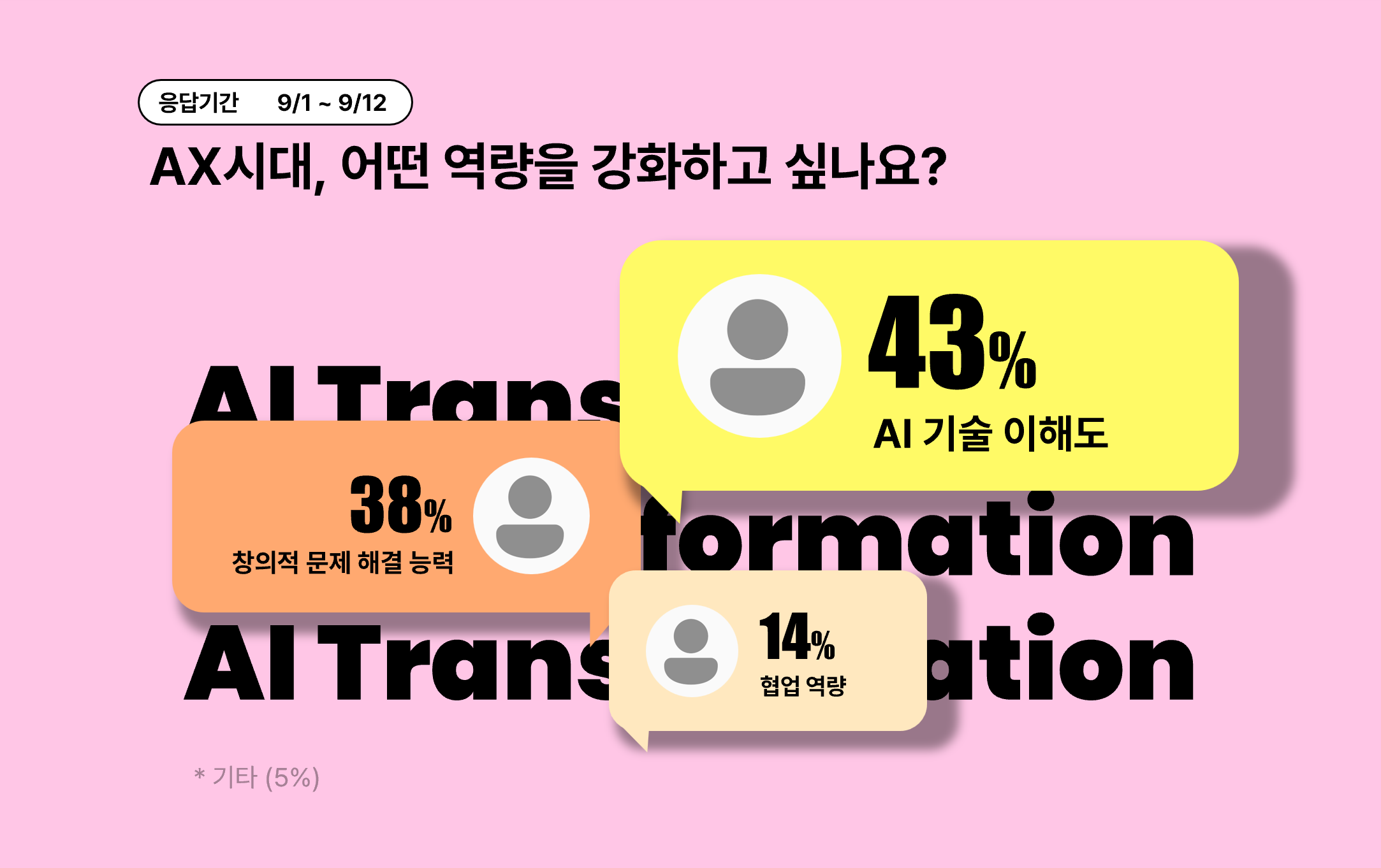 거의 모든 분야의 변화가 진행되고 있는 현 상황에서 AI에 대체되지 않을 경쟁력을 가지려면 우리는 어떤 역량을 강화해야 할까요? 기술은 기술로 대응한다, 'AI 기술 이해도를 높여야 한다(43%)'는 응답과, AI를 활용해 어떻게 어떤 문제를 해결할 지 '창의적 문제 해결 능력을 갖춰야 한다(38%)'는 응답이 가장 두드려졌어요. |