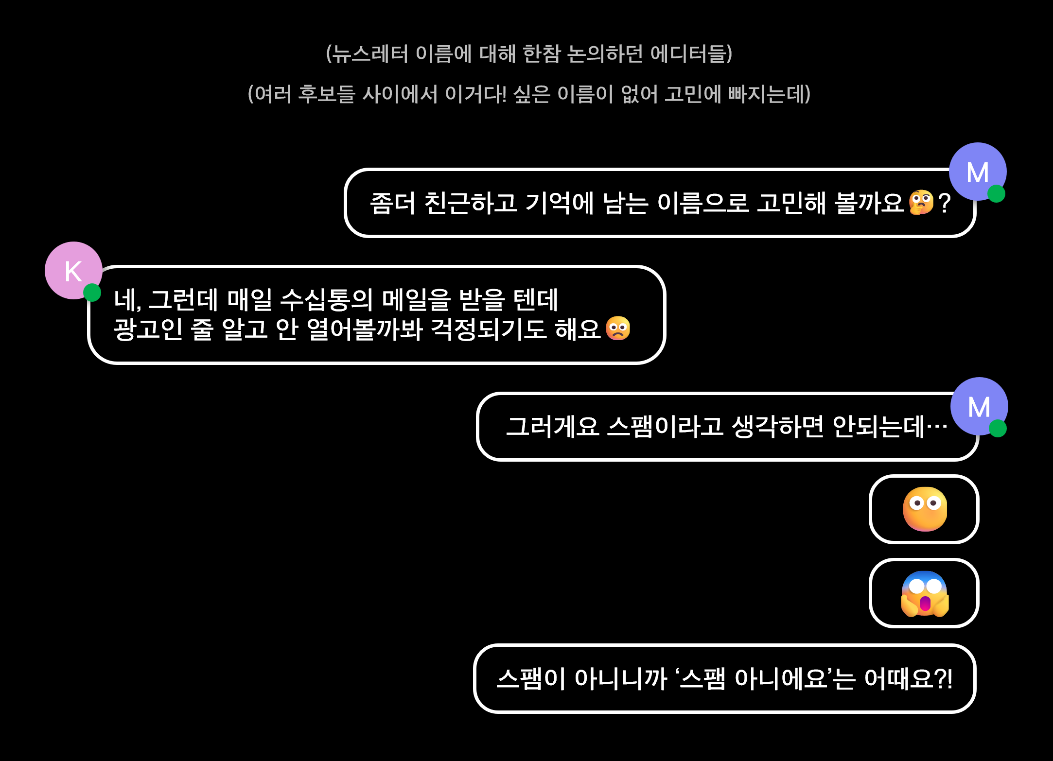 여기까지 <스팸 아니에요>의 지난 1년을 돌아보았습니다. 저도 지난 레터들을 다시 보면서 ‘이렇게 다양한 이야기를 만들었구나!’ 생각하는 동시에 ‘다음 달 주제는 뭘로 하지’ 벌써부터 무게감이 느껴지는데요(ㅎㅎ) 뉴스레터 오픈율 100%를 기록하는 그날까지, 사우 여러분과 소통하며 더 알찬 내용으로 달려보겠습니다, 앞으로도 많은 관심 부탁드려요!