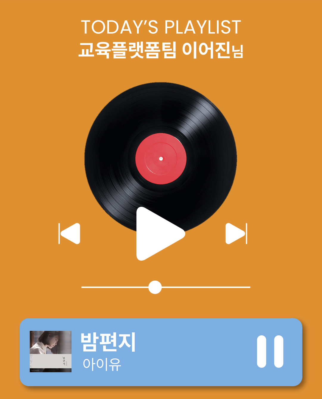 1위는 이번 달 소개해 드리는 지금 이 계절, 나의 플레이리스트( ᵕ·̮ᵕ )♩입니다. 누가 개발자는 다 T라고 하던가요(✋˙࿁˙ ) 말랑말랑한 감성으로 설문 응답을 꽉 채워주셔서 정말 놀랐답니다. 자세한 내용은 ↓쩌어기 아래에서↓ 확인해 주세요!