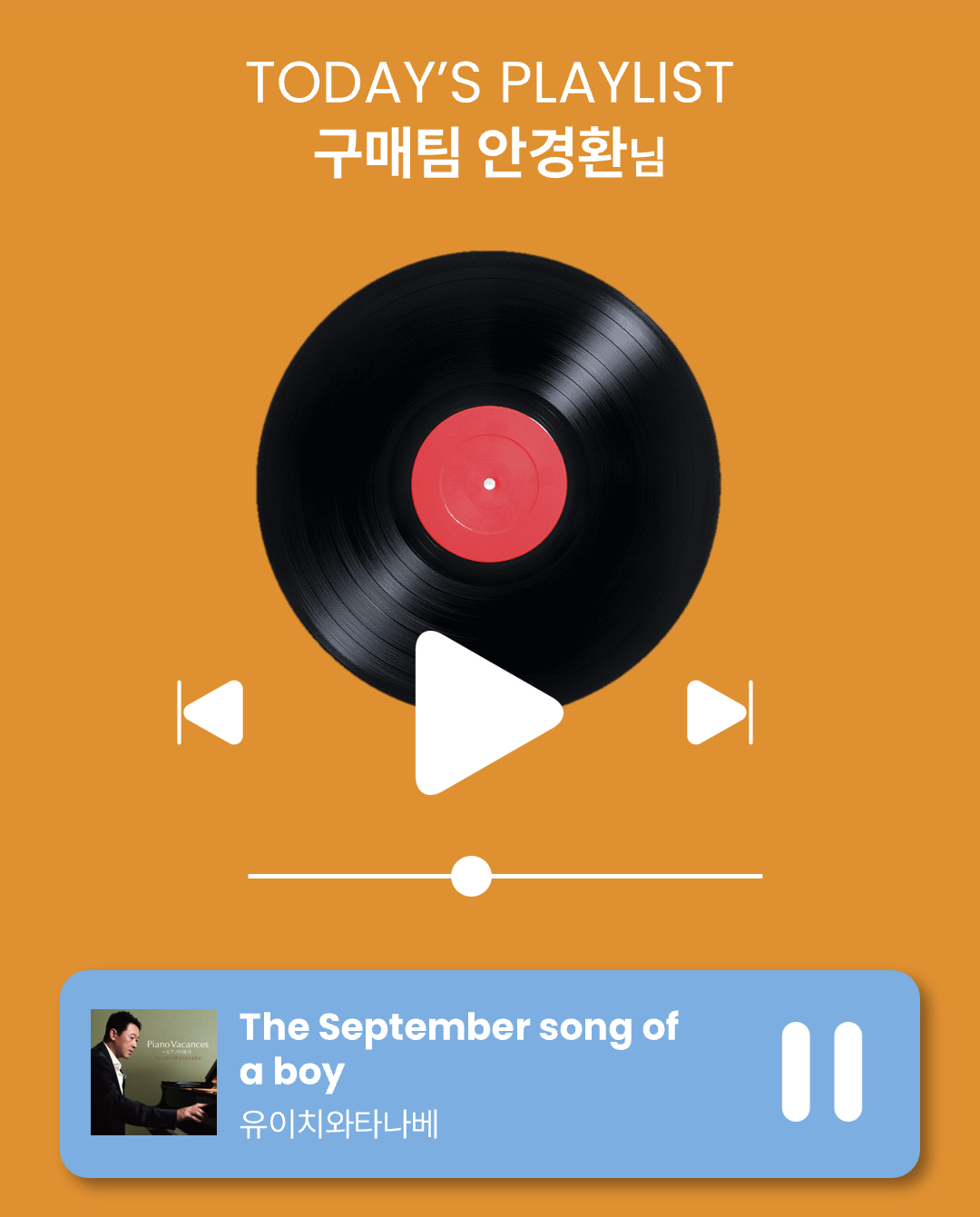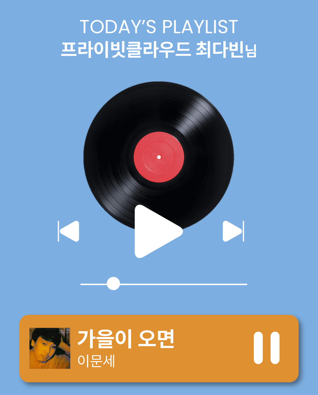 결혼 후 아내가 첫아이를 임신했던 게 가을 무렵이었는데, 그 때 이 노래를 들었던 것 같아요. 아내에게 임신했다는 소식을 듣자마자 태명도 '가을'이라고 지었죠. 딸아이가 태어난 후에는 가사를 더욱 곱씹으며 듣게 되는 것 같아요. 온 국민의 사랑을 받은 명곡이기도 하지만 가을이가 처음 왔던 그날의 설렘과 기쁜 감정이 더해져 저에게 더욱 특별한 노래가 된 것 같아요. |