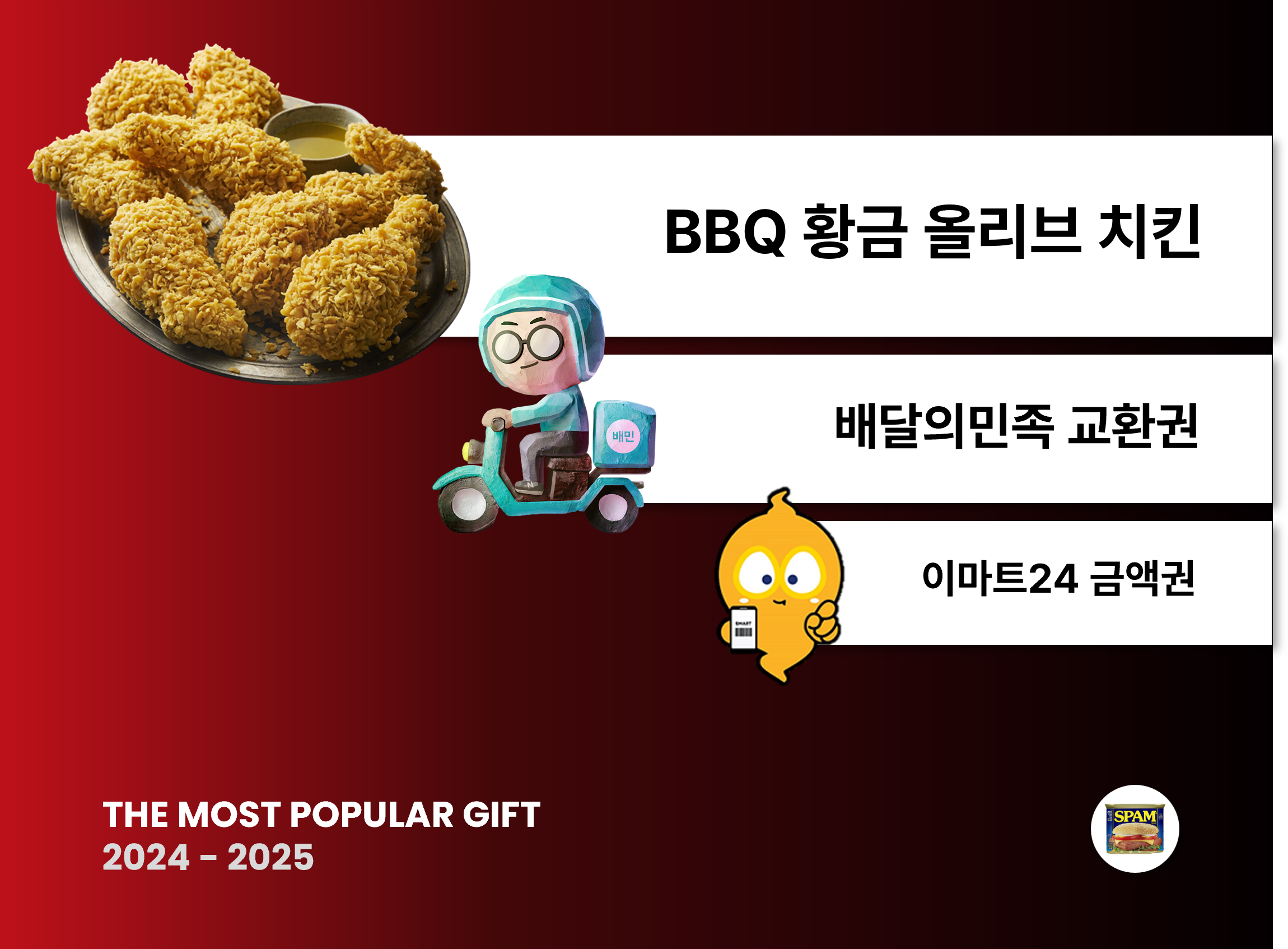 가장 많은 분들의 참여를 이끈 경품은 ‘아이앤슐랭’ 인기로 검증한 여러분들의 맛집 사랑과 일맥상통하는 듯합니다. 부동의 1위는 BBQ 황금올리브 치킨 기프티콘이었고, 배달의민족 교환권, 이마트24 모바일 금액권이 2, 3위를 이어갔으니까요.