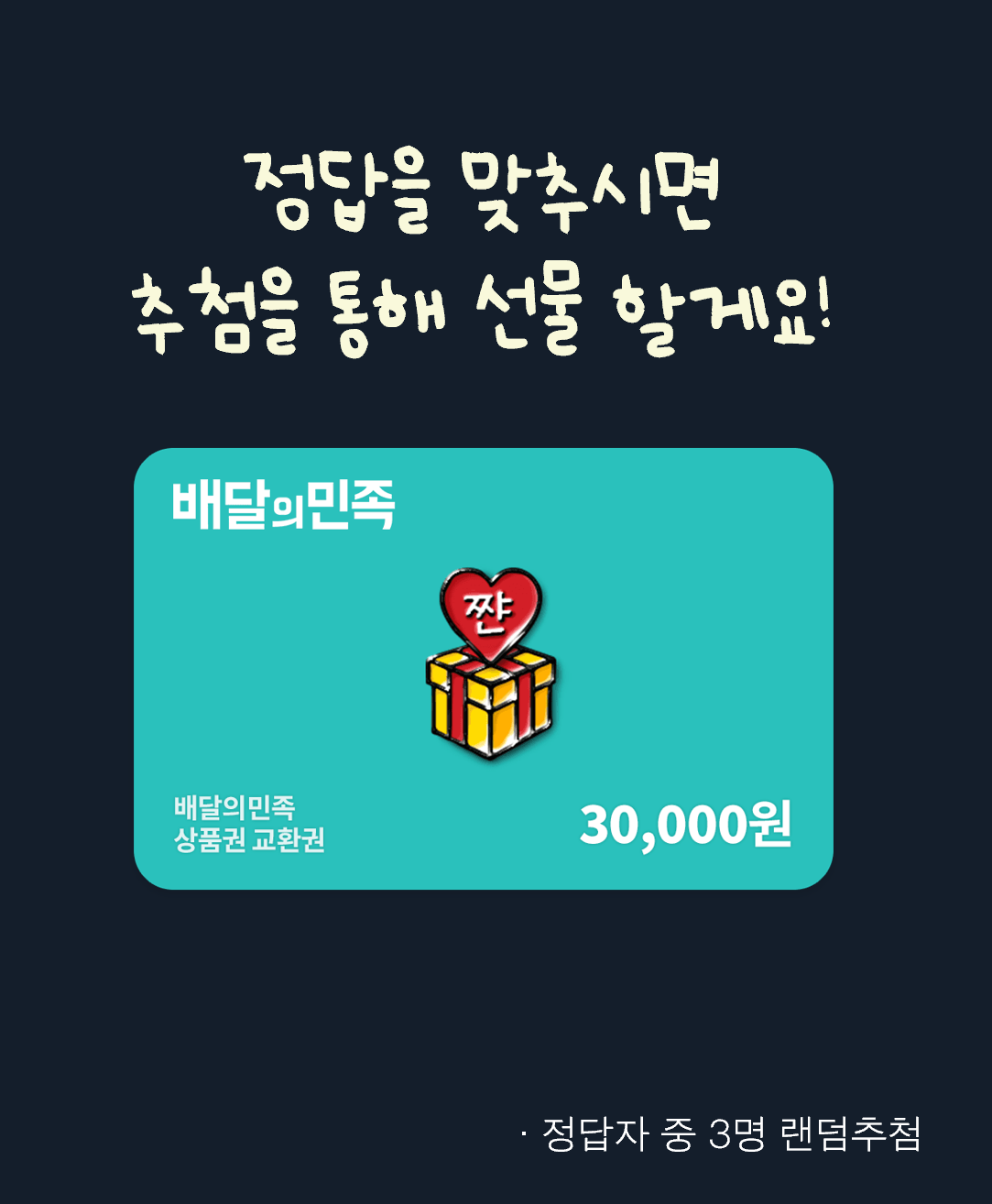 정답을 맞춘 분들 중 3명을 랜덤 추첨해 배달의민족 3만원 교환권을 드려요!